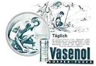 | | |  | | | | | | "Täglich mit Vasenol-Körper-Puder abgepudert, erhöht das Wohlbefinden und die Leistungsfähigkeit. Wäsche und Strümpfe werden geschont."
