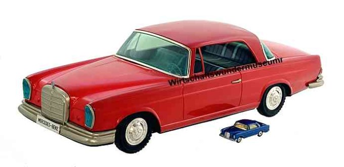 | Schicker Mercedes 300 SL von Bandai. Die Flügeltüren lassen sich per Kabelfernbedienung öffnen! Länge ca. 22 cm |  | Riesiges Mercedes-Blechauto "Made in Japan", Länge 60 cm! Zum Größenvergleich daneben ein Mercedes-Coupé von Corgi Toys im gebräuchlichen Spielzeugauto-Maßstab von 1:43.