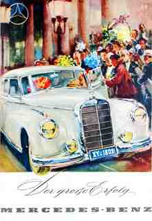 der in den Nachkriegsjahren trotz mittlerweile anachronistisch wirkender Optik noch einen respektablen Absatz findet. Ohne falsche Bescheidenheit wird Mitte der 50er der Typ 220 als „Autorität im Verkehr“ beworben, zudem der Typ 300 als „Wagen, den die ganze Welt bewundert“ und der „auf Wunsch auch mit einer Trennwand zum Fahrer ausgestattet“ werden kann. Ansonsten vertraut Mercedes auf die alleinige Wirkung seines traditionell guten Rufes.