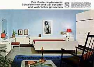 | |  | | "Wohnzimmerschrank 985.-, echt Nußbaum furniert. Für Ihr Fernsehgerät ist Platz vorgesehen." | | "Auch immer mehr ältere Menschen und gerade die, die im Herzen jung geblieben sind, wollen auf die gemütliche Atmosphäre einer zeitgemäßen Einrichtung nicht mehr verzichten."