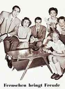 "Dein politisches Barometer" "Ist denn Konrad Adenauers Blick / siegesfroh und zuversichtlich heute? / Das ist für die deutsche Politik / nämlich furchtbar wichtig, liebe Leute! / Oder werden etwa gar schon morgen / seine edlen Züge wieder bitter, / weil den Diplomatenschädel Sorgen / schwarz umwölken wie ein Ungewitter? / Kauf Dir einen Graetz, verschaff dir Klarheit / und guck täglich in den Bildschirm rein! / Da siehst Du die ungeschminkte Wahrheit / und wirst stets - dank Graetz - Im Bild sein." - Zeitschriftenwerbung des Fernsehherstellers Graetz.