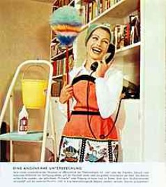 "Eine angenehme Unterbrechung... beim immer weiderkehrenden Hausputz ist offensichtlich der Telefonschwatz mit "ihm" oder der Freundin. Obwohl viele technische Hilfsmittel zur Verfügung stehen, gilt der Haushalt immer noch als größter Arbeitsplatz der Welt. Die Männer wollen bitte zugeben: der gefürchtete "Putzteufel" alter Prägung ist kaum noch zu finden. Auch beim Großreinemachen verwandelt verwandelt sich die moderne Hausfrau nicht in eine besenschwingende Megäre, sondern versucht, Charme zu bewahren!" - Kalenderblattmotiv