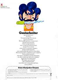 "Gastarbeiter sind dämlich. Dumm. Verschlampt. Verlaust. Faule Fresser. Keine Menschen. Zigeuner. Alles Verbrecher. Bewundernswert, wie unsere Gastarbeiter diese Vorurteile über sich ergehen lassen." (...) "Guter-Gastgeber-Cupon: Ich will ein guter Gastgeber sein und unsere Gäste wie Gäste behandeln. (...) Ich will eine Gastarbeiterfamilie sonntags zum Kaffee einladen. Ich will, weil es jeder kann, Gastarbeiter nicht mehr mit Du anreden." - "Die Kraft der Anzeige. Eine Initiative Deutscher Zeitschriftenverlage."