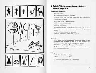 Spielvorschläge für Junge Pioniere: "5. Spiel "Panzer T 4 im Sturmangriff" - Spielverlauf: Zu einer Panzerbesatzung gehören 4 Soldaten. Die Schüler (4) stellen sich in einen Gymnastikreifen und halten ihn in Hüfthöhe. – Nach dem Startkommando laufen die Schüler im Slalom bis zur Schußlinie. – An der Schußlinie nimmt jeder Schüler einen Schlagball auf und führt einen Zielwurf aus dem reifen auf die Panzerattrappe durch. – Danach laufen alle 4 Schüler im reifen geradlinig zurück und übergeben den Reifen und die Helme an die nächste Gruppe (Panzerbesatzung)." – 4.Spiel: "Wir Grenzsoldaten schützen unsere Republik" (1976)