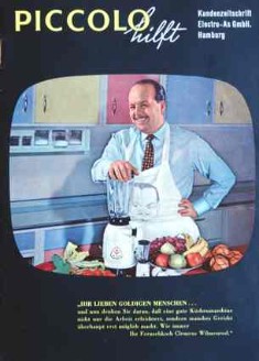 In meinen Augen das schönste Wilmenrod-Zeitzeugnis in gedruckter Form überhaupt: "Piccolo hilft", eine Kundenzeitschrift der Firma "Electro-As", in der Clemens Wilmenrod in schickstem zeittypischen Wohnambiente die vielfältigen Einsatzmöglichkeiten der multifunktionalen Küchenmaschine "Piccolo" vorstellt (vom Staubsaugen bis zum Pudel-shampoonieren!). Und ein paar typische Wilmenrod Rezepte gibt es obendrein: so den "Augenöffner (ohne Alkohol)" und den "Augenschliesser (mit Alkohol)"... | | "Der Fernsehkoch Clemens Wilmenrod - Es liegt mir auf der Zunge" |