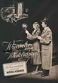"Freude auf Lebenszeit" "Anbaumöbel... ursprünglich geboren aus dem Gedanken, die Wohnraumenge unserer Zeit zu überbrücken, hat man mit ihrer Schaffung nicht nur aus der Not eine Tugend gemacht, sondern sie darüber hinaus zu etwas Endgültigem und Selbstständigem entwickelt, das auch dann Berechtigung haben wird, wenn wir dereinst über das Kapitel Wohnraumnot die Überschrift "Es war einmal..." setzen können." - Möbel-Hübner, Berlin - "Alleinverkauf Musterring-Möbel", Möbelkatalog (O.J., schätzungsweise frühe 1950er Jahre. Allerdings enthält der Katalog auch Elemente, die eher den 1930/40er Jahren zuzuordnen sind. Möglicherweise handelt es sich also um eine in den 50ern teilweise überarbeitete Vorkriegsausgabe)