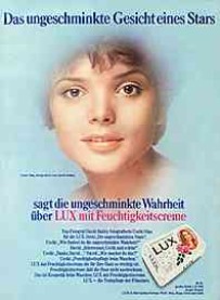 | | "Meine LUX ist mild und rein - so sanft belebt sie meinen Teint", Elke Sommer (1965) | | "Das Milde und Zarte an LUX - das ist es, was meinen Teint so behutsam pflegt!", Nadja Tiller (1966) |