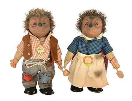 |  | |  | | "Hör Zu - Redaktionsigel" Mecki mit seiner Frau Micki, knapp 30cm hohe Figuren der Firma Steiff | | Privatfoto, rückseitig handschriftlich: "Hiltrud, die Jüngste, 8 Jahre, mit ihrer geliebten Mecki-Familie (Das Edelweiß vom Weltenstein mitgebracht!)" (1958)