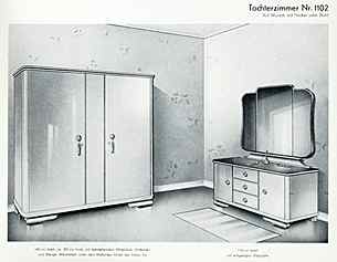 |  | "Die ideale Junggesellenwohnung - dem Lebensgefühl moderner Menschen entsprechend, die Vorliebe für strengen Aufbau haben und ihrem Zuhause den Stempel eines persönlichen Geschmacks verleihen möchten, dazu ist das Wohnschlafzimmer "Jenny" hervorragend geeignet." (1962)