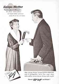 | |  | |  | | "Ohne seinen Herren-Knirps geht Karl Schönböck, der Kavalier des deutschen Films, nicht aus." | | "Bei Knirps-Wetter: Immer tip-top mit Knirps!", Sonja Ziemann - Mehr Werbung mit Stars und Prominenten der 50er und 60er Jahre HIER | | ""Knirps-Wetter" bring Dieter Borsche nicht in Verlegenheit. Seine Frau sorgt schon dafür, daß er seinen Herren-Knirps nicht vergißt." |