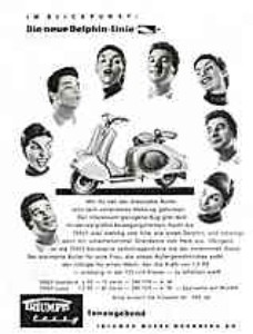 | |  | |  | | TRIUMPH tessy - "Die neue Delphin-Linie - Mit ihr hat der klassische Rolller jetz sein vollendetes Make-up gefunden. Der interessant gezogene Bug gibt dem Vorderrad größte Bewegungsfreiheit, macht die TESSY also wendig und flink wie einen Delphin, und schwingt dann mit unnachahmlicher Grandezza zum Heck aus." | | "Wie gern hätt' ich ein Mußestündchen, so ganz für mich allein! Innigster Wunsch so vieler angestrengt arbeitender Frauen, zwar bisher unerreicht, doch sicherlich erfüllbar. - Denken Sie an die viele Zeit, die Sie unnütz verlaufen, zur Arbeit, zum Einkauf, mit den Buben zur Schule oder zum Friseur. Verkürzen Sie Ihre Wege! Mit einer BELLA schmelzen sie auf wenige Minuten zusammen. Sie verhilft Ihnen zu einem erholsamen Stündchen am Abend oder gar zu einem Wochenende seitab des Trubels." | | Vespa - "nicht länger probieren - Vespazieren" |