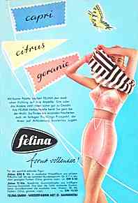|  | | Triumph - "Teen-Modelle 1957" | | Triumph - "Sie findet Anklang - ...überall ist sie gern gesehen - jeder mag sie gut leiden. Ihr natürlicher Charme und ihre vollkommene Figur lassen sie zum Mittelpunkt jeder Gesellschaft werden." | | felina - "capri - citrus - geranie" |