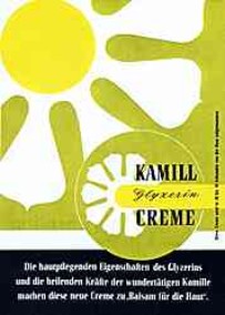| | Schwarzkopf - "Jede Haarwäsche wird zu einer Haarkur durch GLEM Öl-Ei-Schaumpon" | | Kamill Glyzerin Creme - "Die hautpflegenden Eigenschaften des Glyzerins und die heilenden Kräfte der wundertätigen Kamille machen diese neue Creme zu "Balsam für die Haut"." | | Kamill Glyzerin Creme - "Diese Hautcreme neuer Art ist durch die hautpflegenden Eigenschaften des Glyzerins und der heilenden Kräfte der Kamille - doppelt wirksam!" |