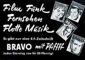| | |  | | | | | | "Film Funk Fernsehen Flotte Musik - Es gibt nur eine 4 F-Zeitschrift - BRAVO mit Pfiff - Jeden Dienstag neu für 50 Pfennig!" | | |