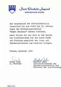 | | "So sind wir", Begleitschreiben: "Das Sekretariat der FDJ-Kreisleitung überreicht Dir aus Anlaß des 30. Jahrestages der Pionierorganisation "Ernst Thälmann" diesen Bildband. Damit wollen wir den Dank an die Partei der Arbeiterklasse für die stete Hilfe und Fürsorge gegenüber den Jung- und Thälmannpionieren zum Ausdruck bringen."