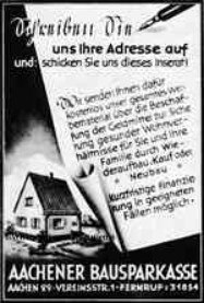 Aachener Bausparkasse – "Wir senden Ihnen (...) unser gesamtes Werbematerial über die Beschaffung der Geldmittel zur Sicherung gesunder Wohnverhältnisse für Sie und Ihre Familie durch Wiederaubau, Kauf oder Neubau."