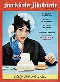 | | Funk und Fernseh-Illustrierte - Titel: "Angelika Feldmann ist allen, die schon zur deutschen Fernseh-Gemeinde zählen, als Ansagerin gut bekannt. Sie hofft, daß ihr "Bekanntenkreis" noch größer wird." - Thema z.B.: Ärzte, Kassen und Patienten - Die Situation der Sozialversicherung in der Bundesrepublik" | | Frau im Spiegel - Titel: "Eine Frau mit Sex-Appeal ist Lilli Palmer in dem Film "Feuerwerk", in dem sie alles durcheinander wirbelt und schließlich doch zum guten Ende führt." - Thema z.B.: "Die geheime Frauen-Arbeitslosigkeit - In den besten Jahren "untauglich"?" | | Frau im Spiegel - Titel: "Ein leichtes Mädchen - eine "Veronika", ist die junge Züricher Schauspielerin Erica Beer in dem Film "Die goldene Pest". - Themen z.B.: "Eine Erscheinung unserer Zeit: Der müde Wochenend-Mann", "Wie sieht der Ausländer die deutsche Frau?"