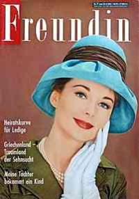 | |  | |  | | CONSTANZE - Themen z.B.: "Gegen den Herztod der Frauen", "Hilfe, ich bin viel zu gross" | | Freundin - Titel: Die "effektvolle Kopfbedeckung aus Exotenstroh mit einem Seidengeorgetteband (Modell: Carven, Paris) vereint die beiden heute so gern zusammengestellten Farben Braun und Türkis." - Themen z.B.: "Heiratskurve für Ledige", "Meine Tochter bekommt ein Kind"